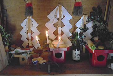 ![]() お供え物です 餅 酒 野菜 鯛 米 塩 水 など |